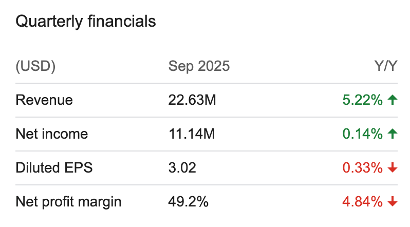 👑 Numbers: In Q3 2025, it posted net income of $11.1M ($3.02 per diluted share) and $31.7M year-to-date ($8.61 per share), and declared a $0.96 quarterly dividend plus a $10 special dividend payable December 1, 2025.
